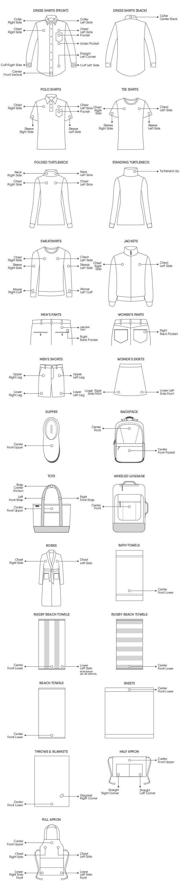 Most of our products offer a choice of multiple monogram locations to give you as many options as possible. Below are the monogram locations for some of our most popular monogrammed products. (Not all available products and locations are shown. Please refer to individual product pages for details on specific items.)